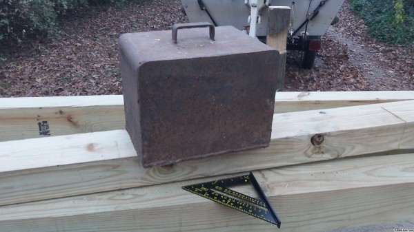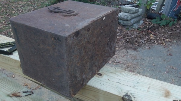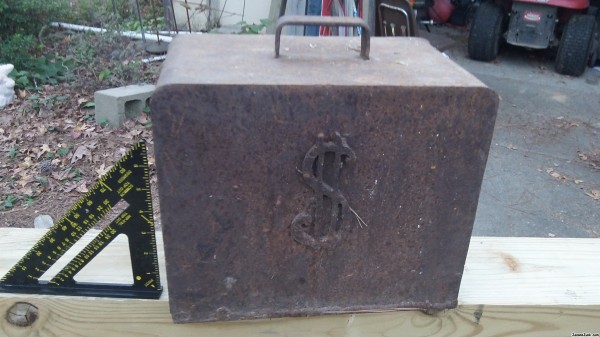 cast iron box, welded closed, no doors, dollar sign on it, weighs 40 lbs, hollow, no labels of any kind, found in a vacant lot