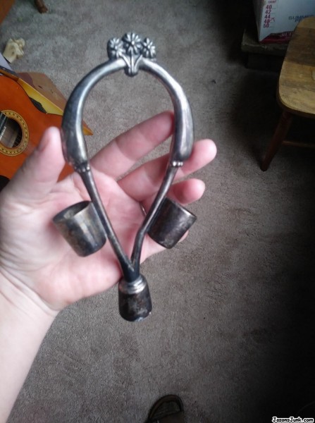 from Petaluma California family. deceased morher in laws stuff so have no idea where she got it or when. About 6-8 inches from top to bottom. There are no threads anywhere. the bottoms inside the cups are flat.