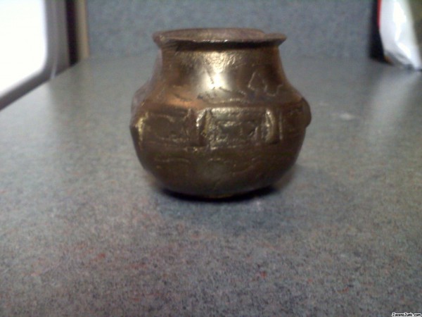 Old looks to be two pieces held together at bottom possibly melted metal. Not magnetic. No markings. I am not sure what it is or what it's worth or even made of. It I'd very heavy. Has engravings but mostly worn off can't tell what it I'd.
