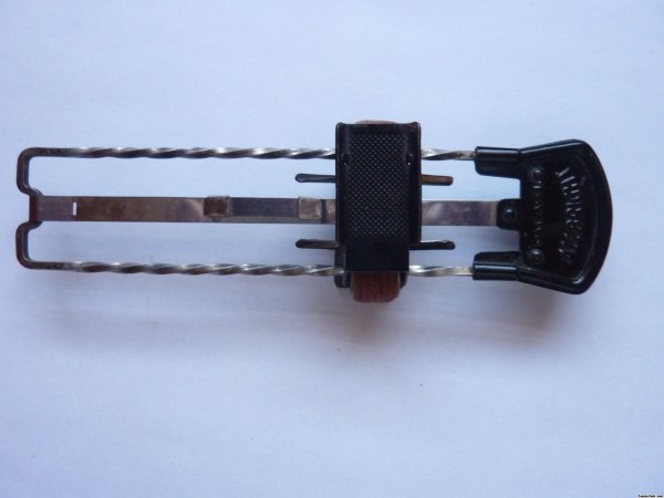 It is stamped "ALLBRIGHT Pat.Appl on the end one would hold on to to use the finger grips to slide the four bladed points of the mechanism back and forth along the spiral tracks with what appear to be rubber rollers. It measures 2 1/2" X 6 1/2".