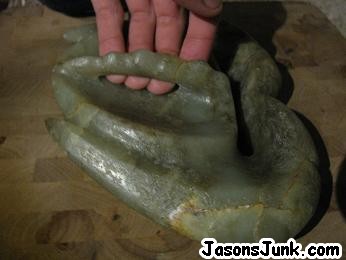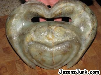 estate sale find. owner took many trips to china and had many high end items, then this guy. it looks kind of like a crab and its soapstone. not much detail, but some... i thought the claws looked odd w/ the 'feathered' look to them. also note the heart shapes you can see on the back shell of the 'crab.' oh, and the weird part - the 'handle' on the back. thats all i've got really. i think its an ornament meant to anchor into a wall w/ mortar. or a mold/stamp thing you would hold and press into something. others have guessed: mask, paper weight, (simply) a crab, and ancient alien poop.