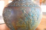 8.5 inches high, metal vase depicting four scenes with Asian characters next to each. The bottom is signed with an Asian mark. There are a number of corrosion marks.