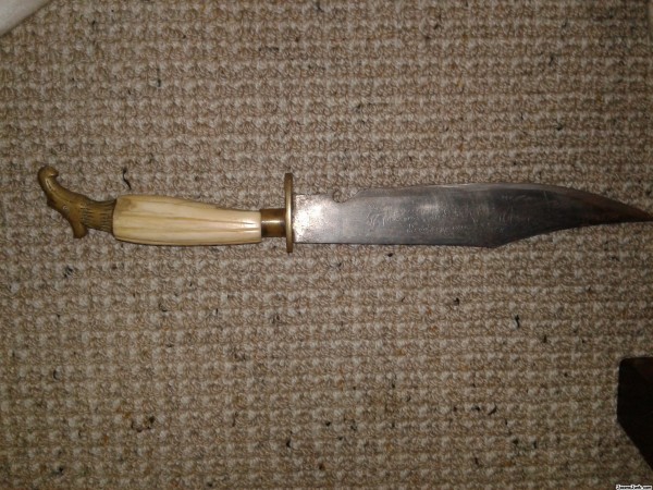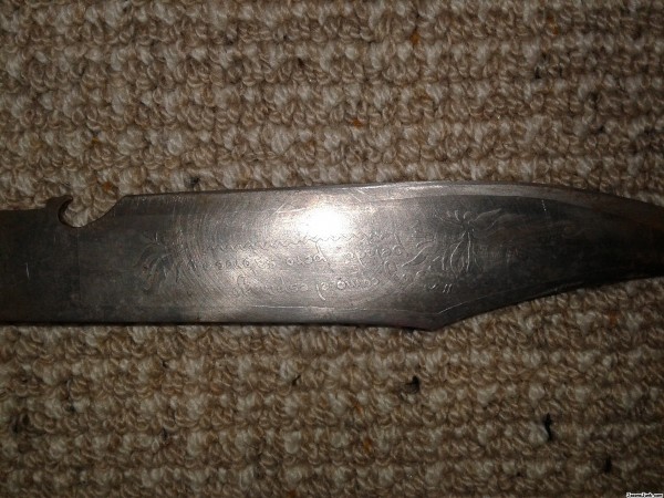 On the blade read " soy como el espinazo pelado sabros ". It's roughly 12 inches long. Not sure if handle is plastic, bone,or ivory.