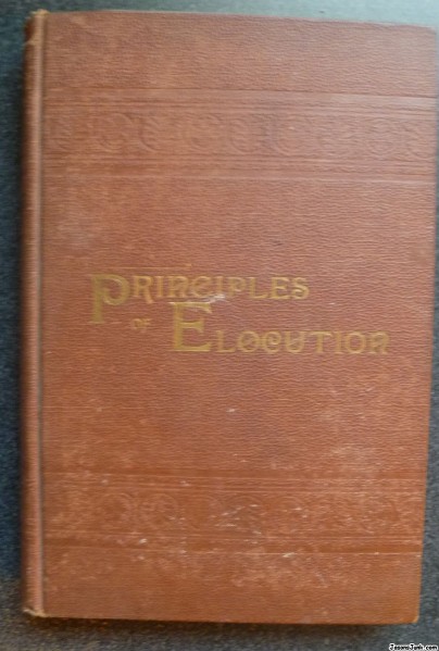 1887 copy of Principles of Elocution by Alexander Melville Bell, son of Alexander Graham Bell. Good condition. No dog-earing of pages. Some wear to the cover. 8" tall by 5.25" across. Spine is about 1". 242 pages. Cover is has a pattern imprinted into it. Title appears to be stamped in gold. Inside it says it is the Fifth edition, "revised and enlarged." Stamped (?) with "Gibson Bros. Printers and Bookbinders Washington, D.C."