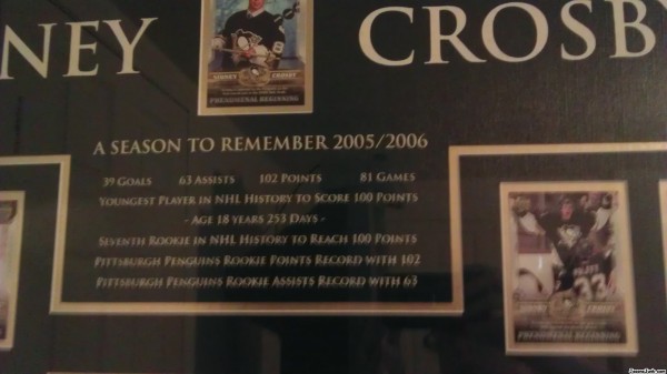 Framed Sidney Crosby's a season to remember 2005/2006. 39 goals. 63 assists. 102 points. 81 game. Youngest player in NHL history to score 100 points. Age 18 years 253 days. Seventh rookie in NHL history to reach 100 point. Pittsburgh penguins rookie points record with 10. Pittsburgh penguins rookie assists record with 63. 19 Upper deck cards phenomenal beginning. Nhlpa 2005 photo file. Sticker of frameworth sports marketing #024748. Official licensed product sticker. Comes with letter of authentication.