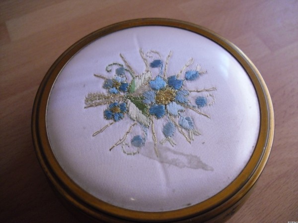 I have a brass coloured lidded pot which has an embroidered top. It is approx 10cm wide and 4cm tall. The lining lifts out and this is plastic with a red flock covering. I have several of tese some are smaller, but I don't actually know what they are! I bought them because they were so pretty.