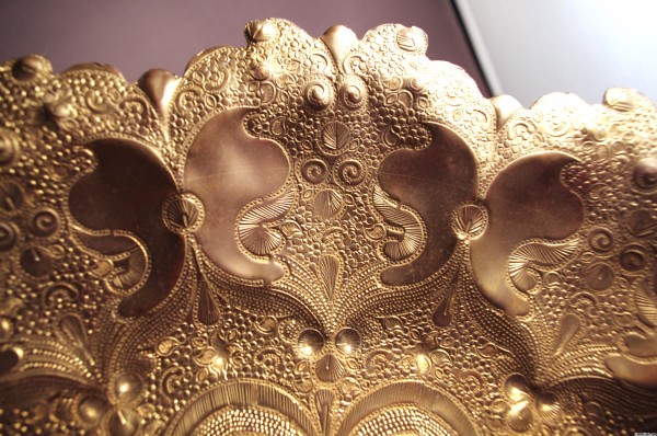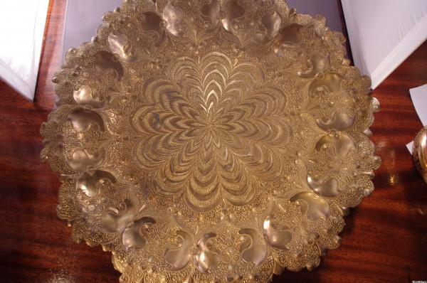 Is this Islamic? Hand hammered? It varies between a yellow color and a bronze color. It is 16" wide. The edges flare up like a large shallow bowl. It is signed on the back, but in what language? Any value? I am new to this, so any info about this tray will be greatly appreciated!