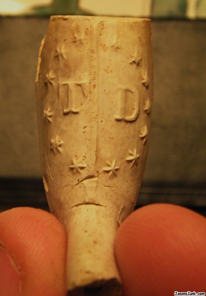 This pipe bowl was dug in a privy dating from 1840-1865. The bowl of course could be earlier than that. It is clay and embossed T W surrounded by thirteen stars, for what I'm assuming are the 13 colonies. Besides the chip in the bowl, it is in excellent condition for it's age. Needing a estimate of worth. Thank you! Bottlesam