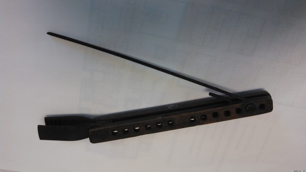 This device measures 8-3/4 inches not including the movable pointer which is 8 inches long. The fork on the end measures 1-3/4 long and 9/16 inch wide and has lateral groves that look designed to grip something it is pushed onto. The pointer's pivot-point can be moved along the length of the device. The numbers 2(space)34 and 10(space)43 appear on one prong of the fork.