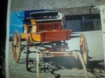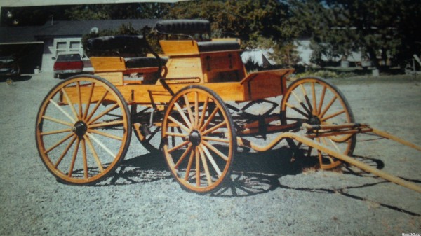 Early 1800s mountain wagon. Total Length:9'. Width:6'7". Heigth:6'. Staves;11' front wheels:42". Rear wheels:47" removable rear seat. Toe board. Double spring. Used by mine owners to get to their mines up in the mountains. Shorter wheelbase to negotiate the tight mountain switchbacks. It was found in a pioneer dump near Chelan wa.in 1988. Rebuilt by the Ox-Bow Trading Co. In Canyon City Ore.