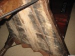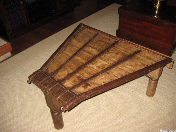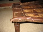 This oak and steel item has been made into a coffee table. The seller didn't know what the top was. To me it looks like some sort of luggage rack from a train, car or carriage. It could also be part of an industrial operation where boxes or parts that would wear a wood surface quickly, slide on the steel raised surfaces. It is very well made with some decoration on the sides that make it seem like it was mass produced not a one-of-a-kind item.