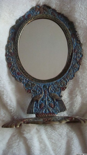 Heavy detail, with awesome colors. The vanity mirror is made of some type heavy metal material, brass maybe. The detail work on it is of some type birds that look to me like peacocks. The bird at the top I have no idea.
