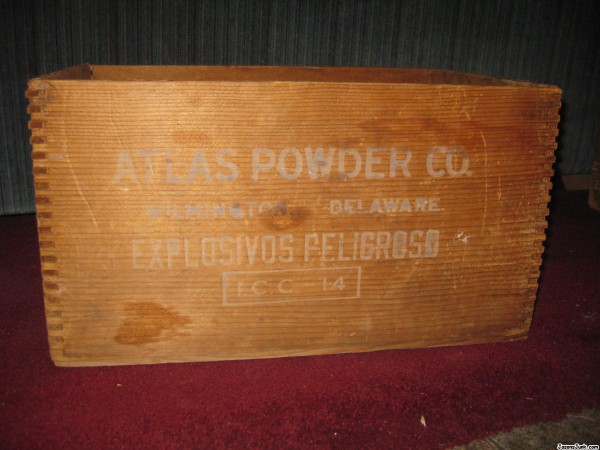 One end of the box has a picture of a globe with "Atlas" written across it and "Explosives" written under the globe. It also says, "REG U.S. PAT. OFF."