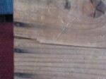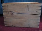This is a wooden box measuring 17.5 x 12 x 9.75 inches. It has has dove tailed or finger jointed corners. Two of the corners fit pretty snugly and two are a little warped and a little loose. They are still intact though. The bottom board of the box is cracked along the grain of the wood the entire length of the board. There is a little sliver/chunk of wood missing from the middle of the edge of the bottom board. The wood of the box is scratched and scuffed, but in pretty good shape for old wood. The wood color is a red brown. (The lighting in some of the pictures make it look grey.)