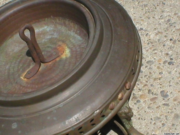 MADE OF COPPER AND BRASS. ABOUT 12" TALL WITHOUT IRON "HANDLE" IN THE MIDDLE, ABOUT 20" WIDE WITHOUT LEGS.THE CENTER IS A "TRAY" AND LIFTS OUT. WHAT IS IT? ANY HELP WOUL,D BE GREATLY APPRECIATED