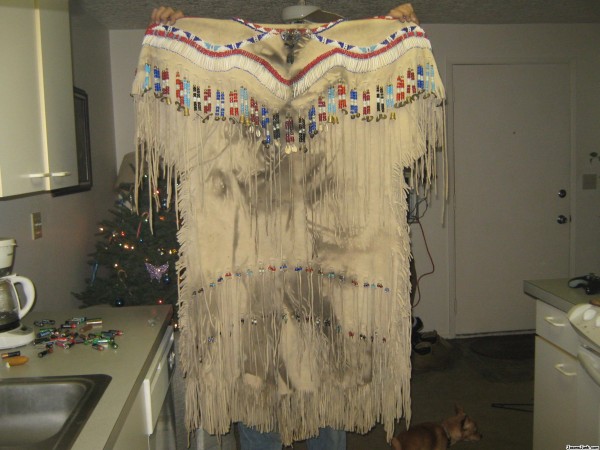 I am not sure about this, I think its nez perce, it has animal teeth,glass beads, handmade, seems to be vintage, two skins sewn with sinew or something, it has damage to the skin from soot and would need to be cleaned, some beads are loose, also it has shells and some jingly coins I think were put on for noise,It weighs approx 40.lbs just not quite sure of value if any.