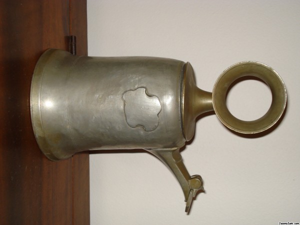 Item may be a teapot. It has a circular handle and a flip-up cover on the spout. This cover has a mark HSB (with a line under) bottom left section are either a lion & a horse or 2 lions; the right section is something I cannot ID. Areas around the spout have hammered decorative lines. The object is very heavy.