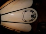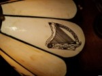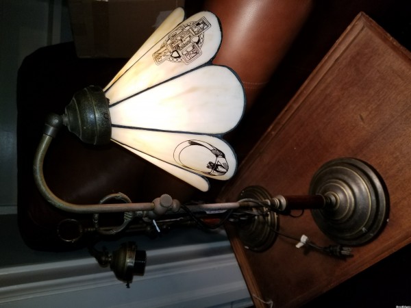 Table or bankers lamp. Hanging leaded glass shade. White curved glass petal panels with black painted Irish themed images. shamrock, harp, celtic cross, claddagh ring.