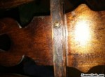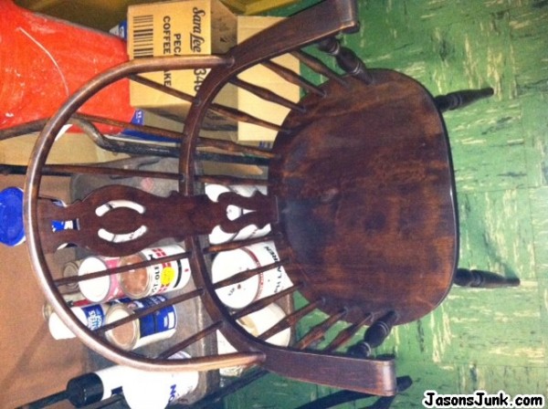 This is a Windsor style chair and I think it is a replica. On the bottom it is marked with a number in white that looks like "925a". (see the third picture) In the second picture you can see a screw. It is in the back of chair,on the rib going into the splat (see picture two) it looks like there is another next to it and that they were both concealed by wooden plugs. The finish on the chair doesn't look too nice and the legs are glued amatureishly as you can see from the third picture. I got it with another chair in the same style but with a rocking bottom. It had two plugs in the back as well which I assume conceal screws also. If you can give me a better idea of the maker, age, value, or anything else interesting, I would appreciate it.