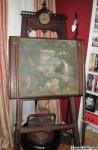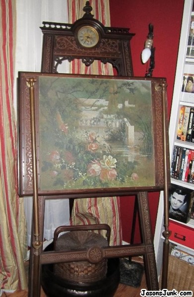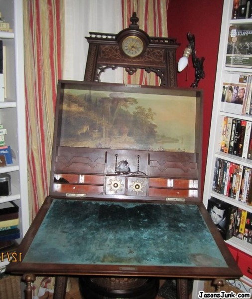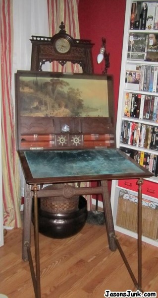 This inherited piece is about 6' tall. The clock is a Gustav Becker, have both fitted crystal inkwells. There is a tripod easel type base, with what appear to be bronze legs that fold down to support desk.