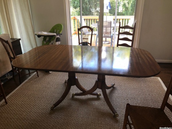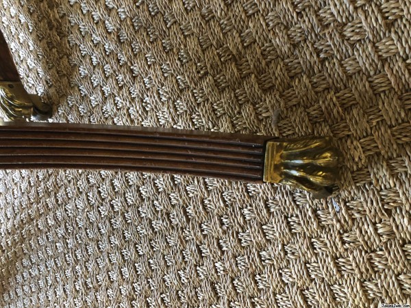 Family history: My great grandmother got this from Stair and Company, imported over 60 years ago, notes say its early 19th century table. Brass claw feet, looks to be a Duncan Phyfe Table, but I have no idea what replica, if its reproduced and when. It had to have been bought over 70 years ago and it was very old when she got it. only marking is a (hand) carved number when you pull leaflet out on the side 14245. It's beautiful.