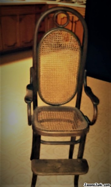 Label on underside of seat said Thonet. (Please see attachment named Thonet Label). I have found a few online that look a lot like this chair, but there is what appears to be a foot rest that I haven't seen on any other ones. Without finding anything with these exact features, I am unable to determine what style or age. I thought it might be a chair for a child, maybe a high chair. It doesn't have a tray, but I think that was common on some types of older ones. Please help. THANK YOU!