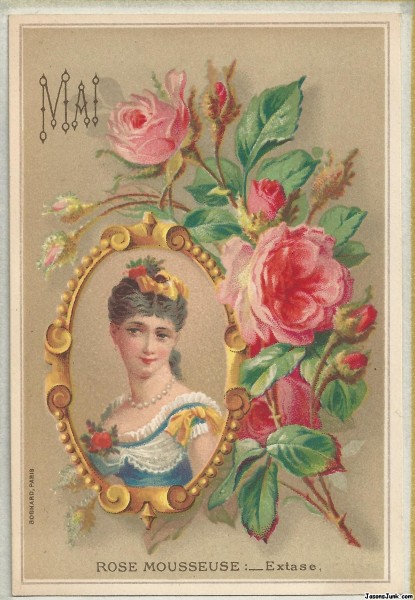 This is a French lithograph made by Bognard of Paris in the late 1800s. From what I've been able to find out, Bognard was one of the leading lithographers in France. The caption reads" "Mai" (May) and below: "Rose Mousseuse:__Extase".(loosely translated with googletranslate: "frothy pink exstacy"). The back is blank, so I don't know if this is a sort of trade card, or simply a pretty print. I cannot find anything like it online. Does anyone know the value of it?