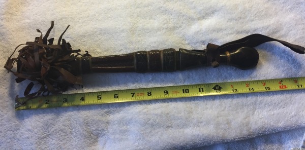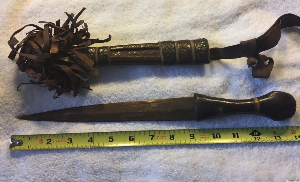 Hand made and well used. Does not appear to be a replica. The leather is worn. The blade appears to be copper and bears markings on both sides. Total length is 14 inches and the blade is 9 inches from the hilt. Most likely African or Mid Eastern.