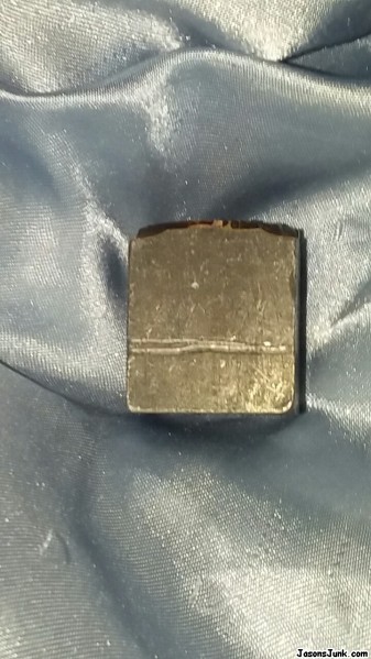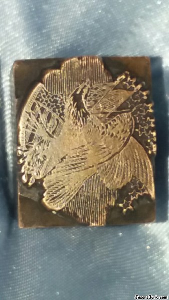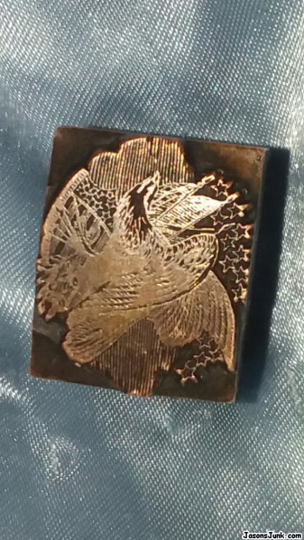 Approximately 1"x1". Very heavy for its size. Top "stamping" part appears to be copper. Appears to have the American eagle with stars, flag, and banner? in the background.