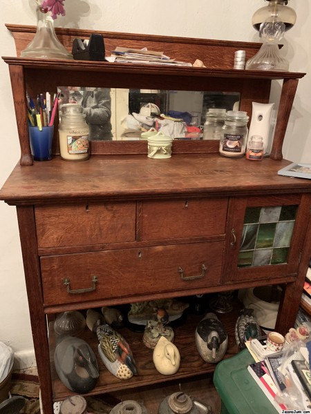 It has two small lined drawers at the top and one long one underneath. They all have locks on the and I have the original key. It also has a stained glass door beside the drawers