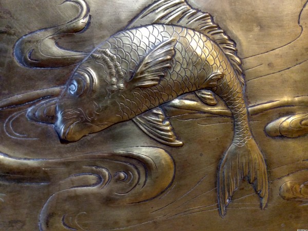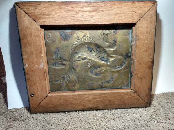 I was told it was a bass but I think it looks like a koi. It's brass and the frame is wood idk what kind