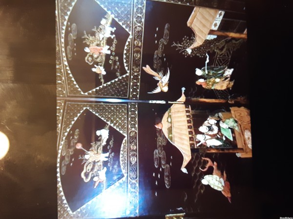 I would just like to know what it is. It looks to be painted maybe and the people are carved out of white ivory. Their are also mother of pearl inlays throughout the screen. It is a 4 panel screen.