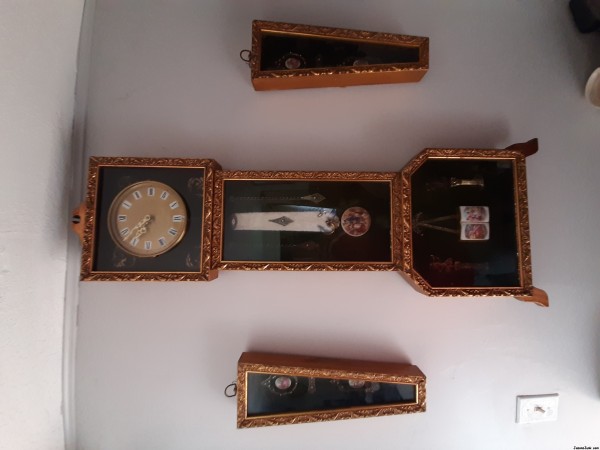 The lining of the shadow box part is a odd shade of green. The man I bought this off mentioned it might be an Andrew Kolb although I can not find any identifying marks or labels. There are matching numbers on the backs of all three pieces. I don't know how old this piece is because it does run on a c battery. This clock does work and keeps good time. Any information on this clock would be greatly appreciated especially maker and possibly value. I enjoy the clock and am looking forward to learning about it. Found in Maine.