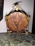 A porcelain (possibly a Madonna due to the halo) in a velvet trimmed frame in a metal filigree leaf stand. The oval frame is roughly 4 inches x 3.5 inches.