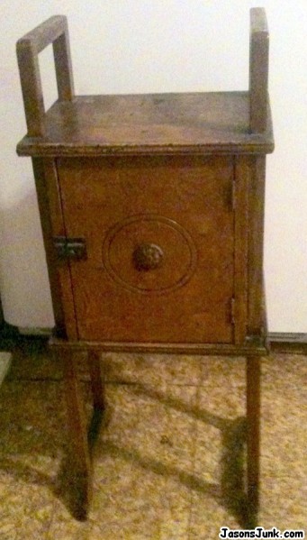 I purchased this unusual small cabinet in a thrift store in Louisville, KY. It is 31" tall x 12.5" wide x 9.5" deep. The inside is lined with a coppery looking metal. There are no stamps or markings on the cabinet. I can't even identify the wood although there is an interesting swirly pattern in the grain that you can't really see in the photos.