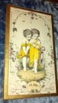 Signed L Penet on both. The cardboard looking paper that they are on is 4x7 approximately. Vivid colors. Black outlines. Drawings are mounted on blue crushed velvet and a gold mat. Wood frames are in almost mint condition. The paper covering the back of frames says "WALLDECOR" all over....and looks old, very small tears in it. Just ADORABLE!! I found out that "Plus Du Tout" means...Not any more or No longer. "En Peu" means...A little bit or something similiar. I love these cupids!