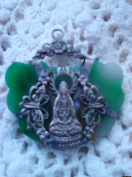 Green jade with butterfly shaped edges; large - about an inch and a half in diameter. A silver (suspected) Buddha (China?) (Tibeten?) enclosed within two butterflies pointed at the figure in the middle. The figure (Buddha?) has a crown in a circle above the head that looks like fire. Looks antique. Looks like real silver that is tarnished very slightly in places. The other side of the item is exactly the same. The silver is very shiny. I found this actually in a free pile at an estate cleaning out...Hoping to learn more about it. Would Sell to interested persons.Please contact lissannesellew@gmail.com with any knowledge, interest, etc. Update - I have recently been educated on how to rule out soapstone or other fake Jade pieces; I have a real piece of Jadeite.