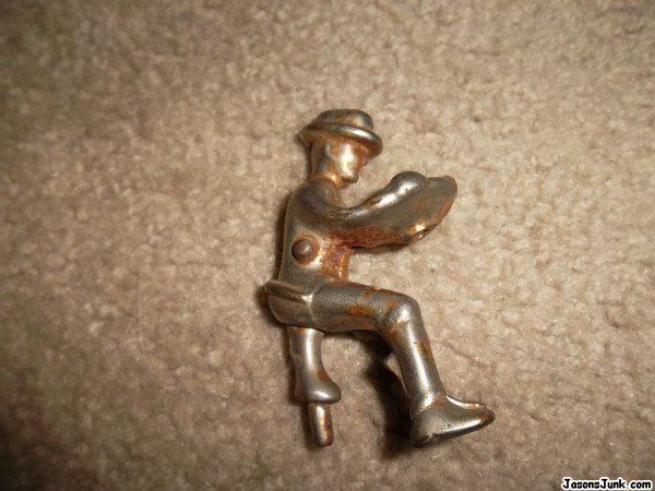 I found this in my late father's things. It is a metal farmer in the seated position with what looks like a steering wheel. It obviously came of of a larger toy, but I need help identifying it before I can sell it.