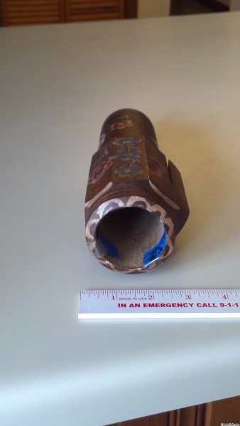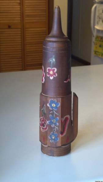 Hand painted wooden mystery object. 12 inches tall, 3 inches wide. Wider end is hollowed out for about 5 inches of total length. A piece of blue masking tape found inside the object says..."hand made painted old switz". Found in a thrift shop and has been taken to four antique shops and countless friends, family, and strangers. No one knows what it is! Please help! Thanks!