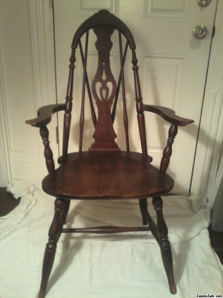 Bought 2 years ago at a yard sale. Paid $25. It's dark wood, sturdy construction. No nails or screws. Carved seat, turned rails and legs. Carved panel in center of backrest. 2 turned support rails in "V" shape behind backrest. Curved arms. Good condition.