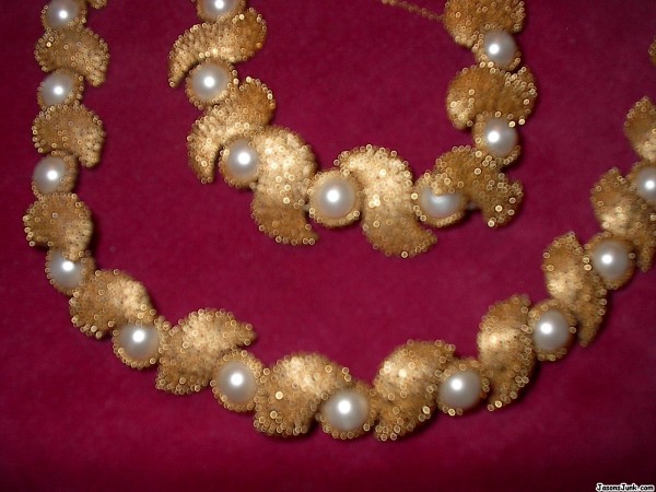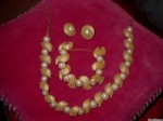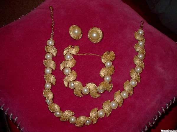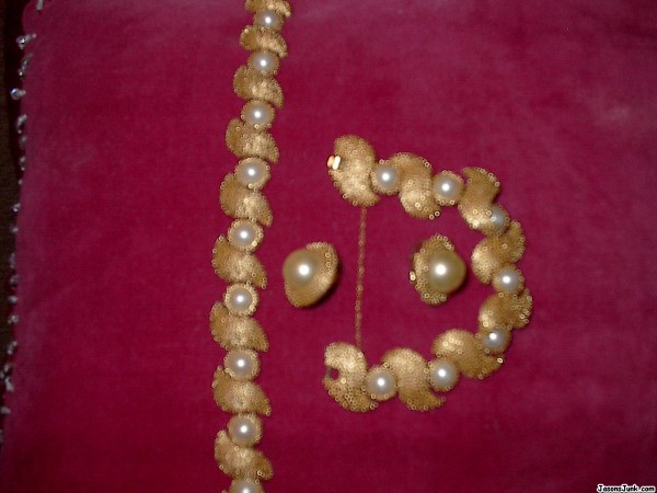 beautiful trifari pearl and gold tone set. necklace, bracelet and earings.