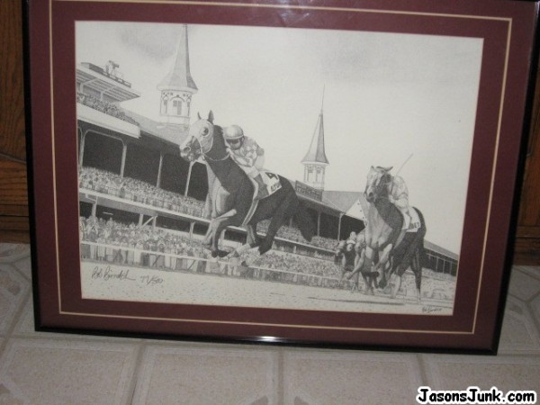 Can't make out the artist but this is a numbered print 77/500. I know it is all done in pencil. Horses are I believe Alysheba & Ubet? Any info and value on this is appreciated. thanks
