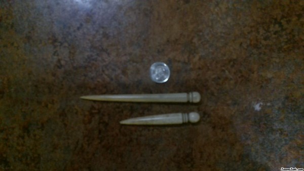 Inherited them from my Grandmother, in Canada. Do not know what they are, but think they may have been to punch holes in material (Leather?), for sewing/mending. Made of bone.