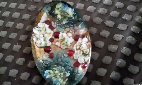 it is made from copper or bronze its covered with a glass facial with raised glass flowerrs and spots any informationin appreciatede