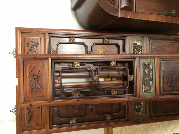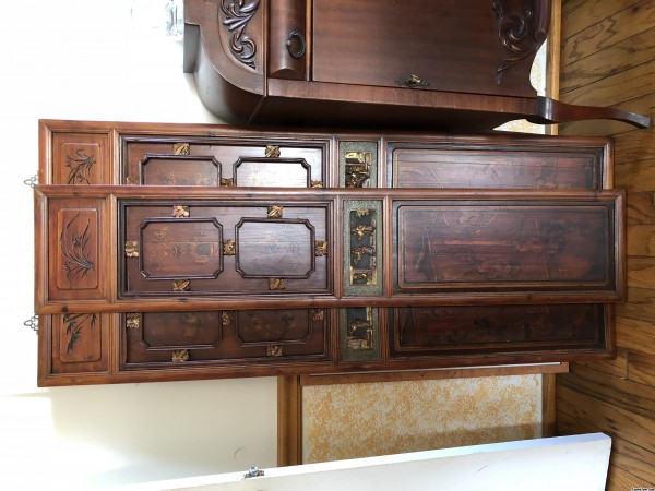 These are three panels that each have unique carvings and inlays. Carvings are gilt in some fashion, but the gilding is largely rubbed away. The top back wooden panel of each slides down, there is a tab on the back of each to lock the sliding "window" in place. They are light, so I think they are bamboo. Scenes look kind of like Kabuki, but I am far, far from knowledgable. Other scenes are of flowers and of birds. What are these?