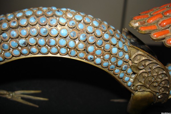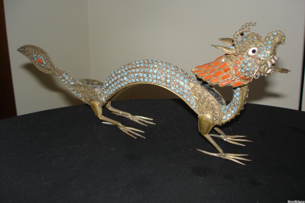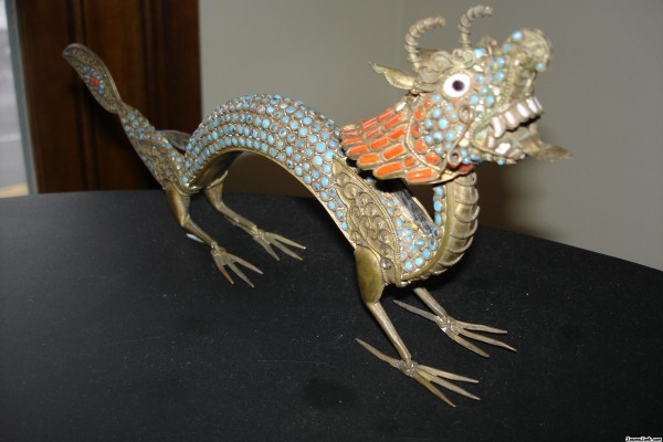 This dragon is 15.5" long and about 5" tall. I'm not sure what the blue and red material is made of, the body is brass. I'd like to know more about its age and where it was made athough I believe it was made in China. Any information would be great, Kurt