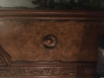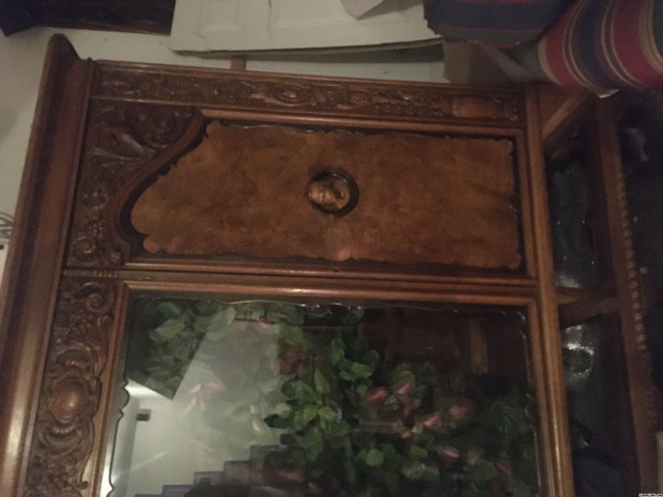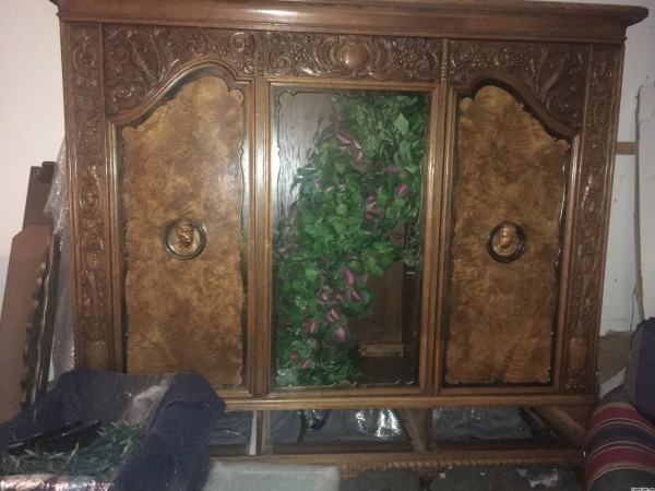 My father had this piece for at least 30 years. I’m not sure where he got it from or how much he got it for but it is a three door wardrobe with a his and her side and glass shelving in the middle. It has three drawers on the bottom. And it has marvelous carvings all over it especially the doorhandles which are carved faces of a man and a woman. It has her feet and looks to be made out of two different types of wood. It’s about 7 feet tall and the width is probably 8 feet and the depth is probably just over 2 feet.