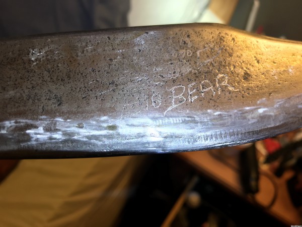 Ok so I am new to all this but it looks like a classic Bowie knife. It’s 12.5 in long with a full tang. It has “big bear†on the blade and right above the handle on the blade it has a big bear stamp and on the other side it has what looks like a 5-25-12 and right below that it looks like it says BBS or maybe BB5 -198. I apologize for lack of anymore information on this blade. I am very curious though. So any information will be greatly appreciated. Thank you for your time