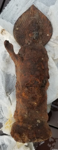 This is what seems to be a metal figure or sculpture that I dug up in my yard. It looks like a religious or royal figure.