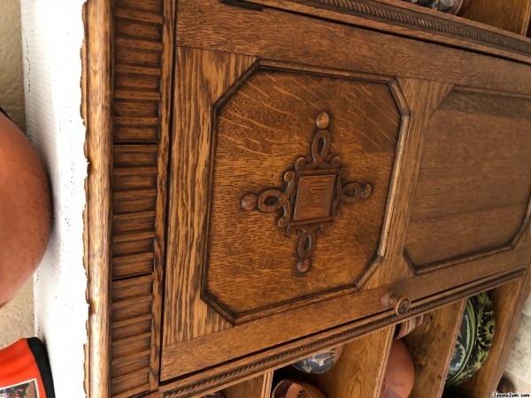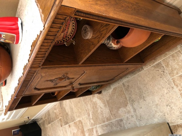 Not sure when manufactured. Appears to be hand made. uses iron pins for shelves.